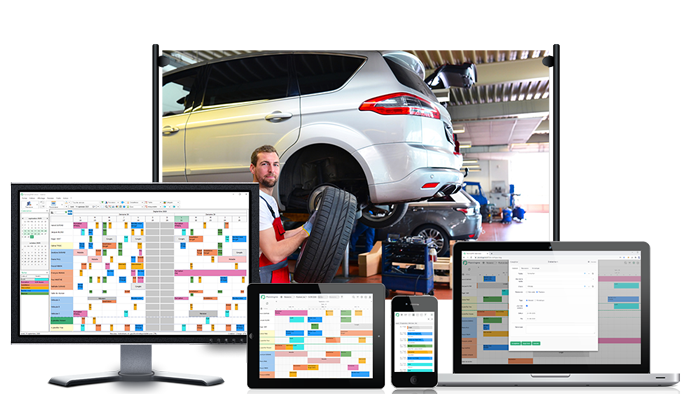 Verbessern Sie die Verwaltung Ihrer Autowerkstatt und steigern Sie Ihre Effizienz dank eines in Echtzeit aktualisierten Terminplans. Planen Sie die an Ihren Fahrzeugen auszuführenden Arbeiten, die Arbeitszeiten und Abwesenheiten Ihrer Techniker oder verwalten Sie Ihre Leihwagen.
