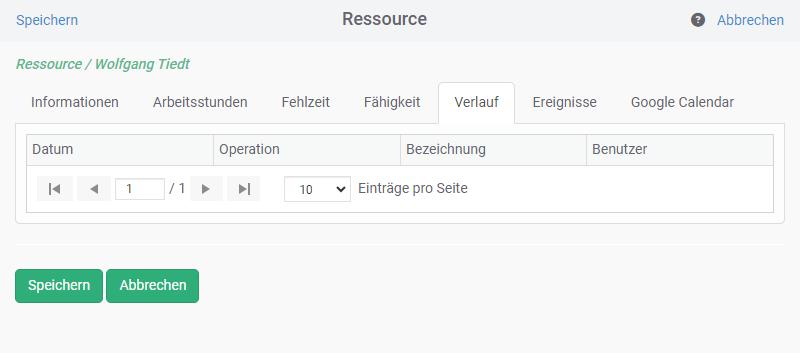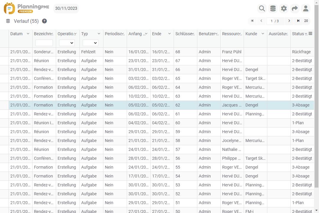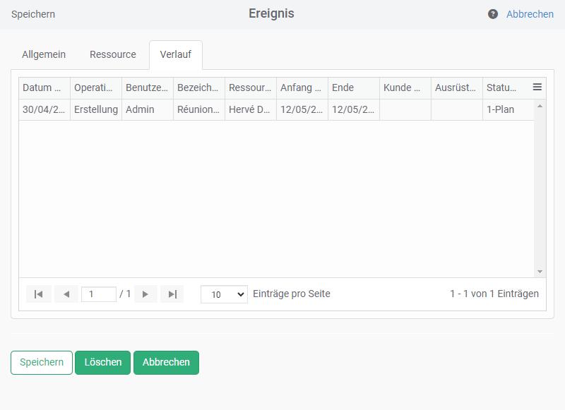 Sie finden "Verlauf" im Menü "Daten". Dieses Fenster enthält alle Erstellungen, Bearbeitungen und Löschungen von Daten in der Planung bezüglich Ereignissen, Ressourcen und Kunden.
