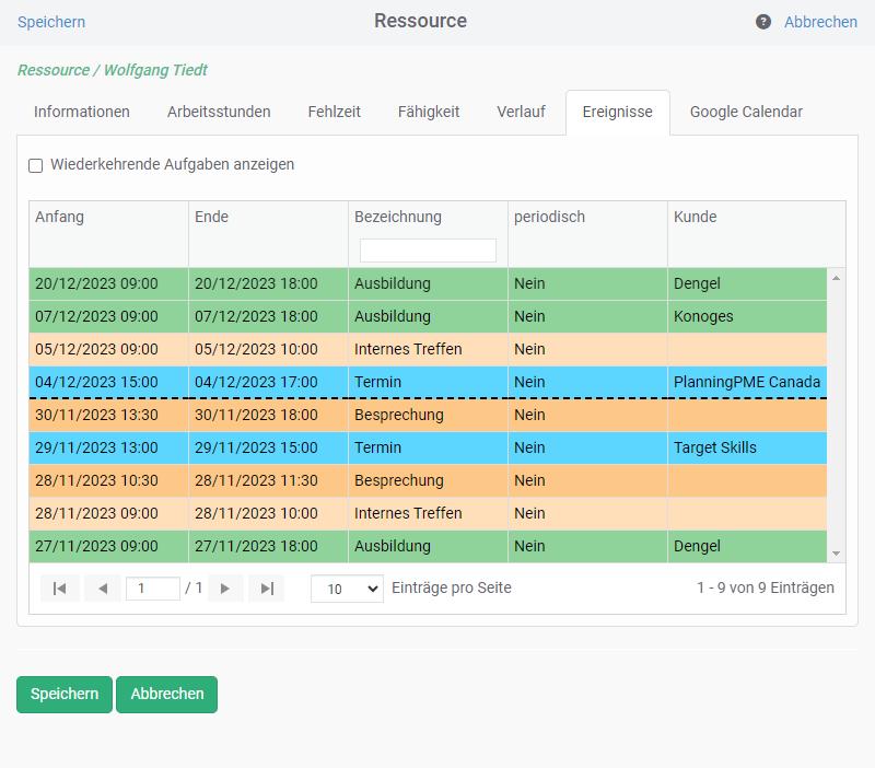 Steuern Sie Ihre Tätigkeit effizient und überlassen Sie nichts dem Zufall. Verfolgen Sie genau alle Planungsmaßnahmen. Außerdem sehen Sie im Blatt der Ressource, des Kunden und des Projekts eine Liste aller vergangenen und künftigen Ereignisse. Jetzt können Sie auf den Verlauf nach Kunden, Projekten, Ressourcen und Ereignissen im Detail zugreifen. Eine neue Registerkarte im Ressourcen- und Kundenblatt ermöglicht es, eine Liste aller vergangenen und künftigen Aufgaben zu sehen.
