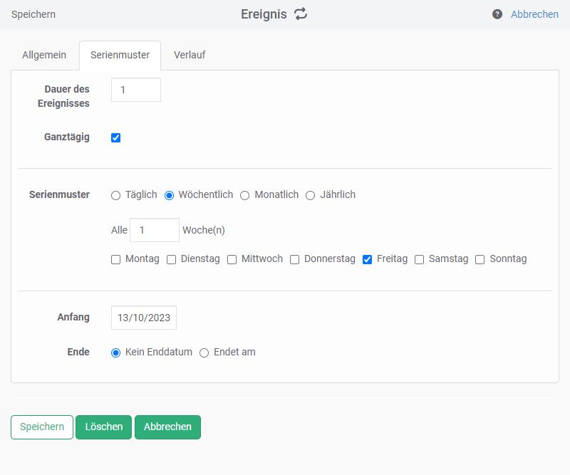 Serienmuster: Täglich, wöchentlich, monatlich, jährlich. Daten: Geben Sie Anfangs- und eventuell Enddatum ein und speichern Sie dann, um die Änderungen zu übernehmen.