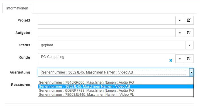 Auswahl von Ausrüstungsgegenständen bei der Erstellung eines Ereignisses: Wenn Sie den Kunden auswählen, wird seine Ausrüstungsliste angezeigt.
