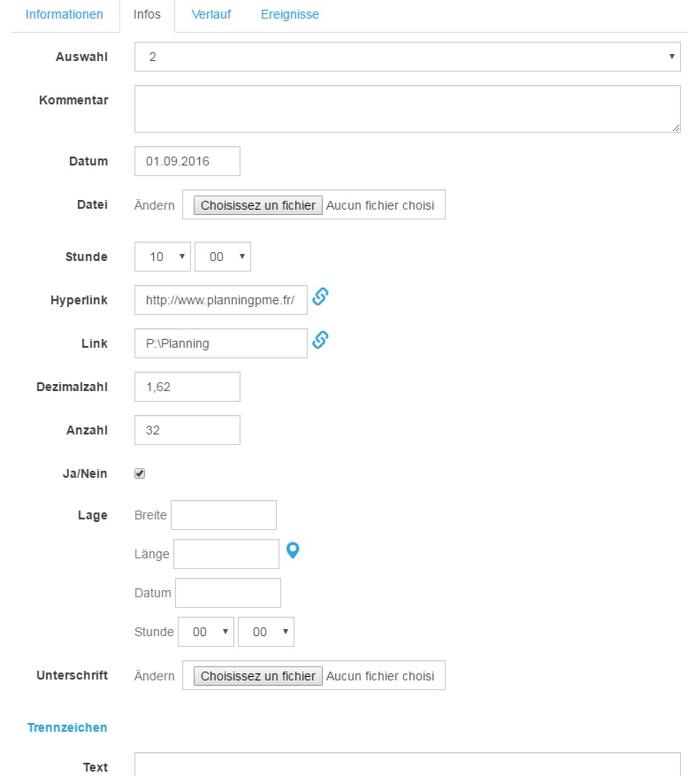 Durch das Erstellen zusätzlicher Felder können Sie PlanningPME Web Access an Ihre Bedürfnisse anpassen, da Sie für Ihren Tätigkeitsbereich spezifische Daten hinzufügen können.