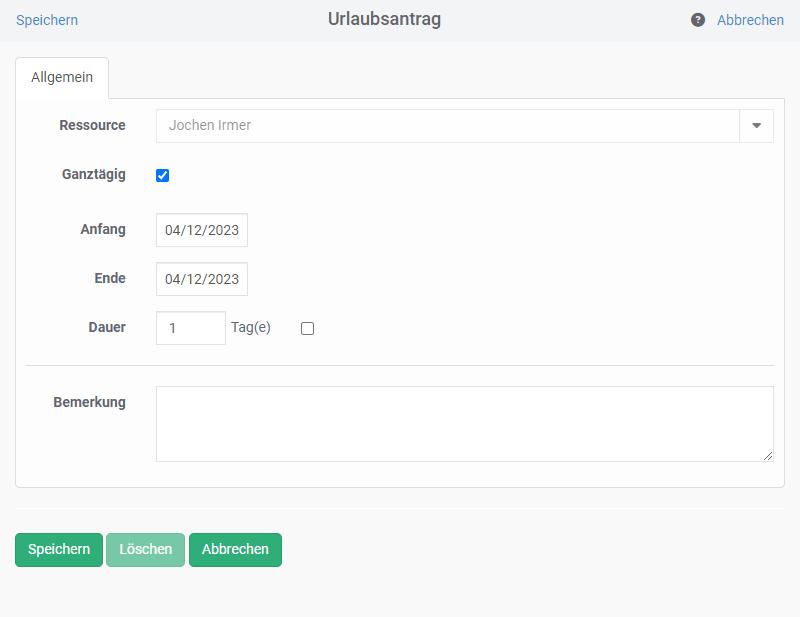 Über das Menü "+" ist ein neuer Eintrag verfügbar, der es jedem Mitarbeiter ermöglicht, auf einfache Weise einen Urlaubsantrag zu stellen.