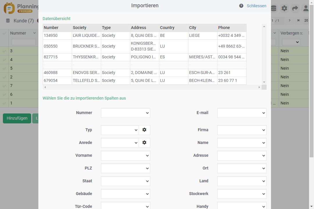 Nach dem Definieren des entsprechenden Felds „Beschriftung“ und der Kundennummer (optionale Daten) in PlanningPME müssen Sie nur noch auf die Schaltfläche „Simulieren“ und dann „Importieren“ klicken.