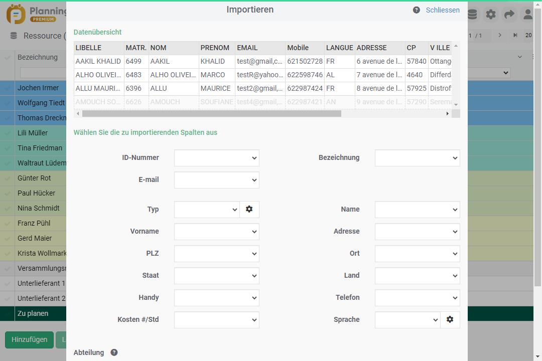 Nach dem Definieren der entsprechenden Felder (Ressourcenbezeichnung, Personalnummer, Name, Vorname Adresse usw.) in PlanningPME müssen Sie nur noch auf die Schaltfläche „Simuler“ klicken, um einen Überblick zum Rendern Ihres Ressourcenimports zu erhalten.