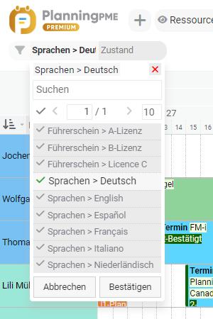Um aus der Planung kompetente Personen herauszufiltern, können Sie den Filter "Kompetenzen" oben auf Ihrem Bildschirm verwenden.