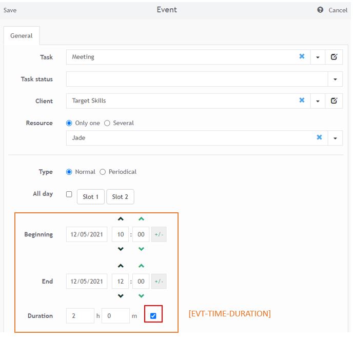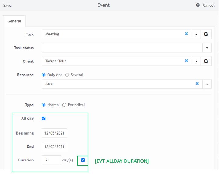 Ein im Dauermodus erstelltes Ereignis ist ein Ereignis, dessen Dauer in Tagen oder Stunden angegeben wird. Für Ereignisse mit einer bestimmten Dauer wird das Ende basierend auf dem Zeitprofil der Ressource berechnet.