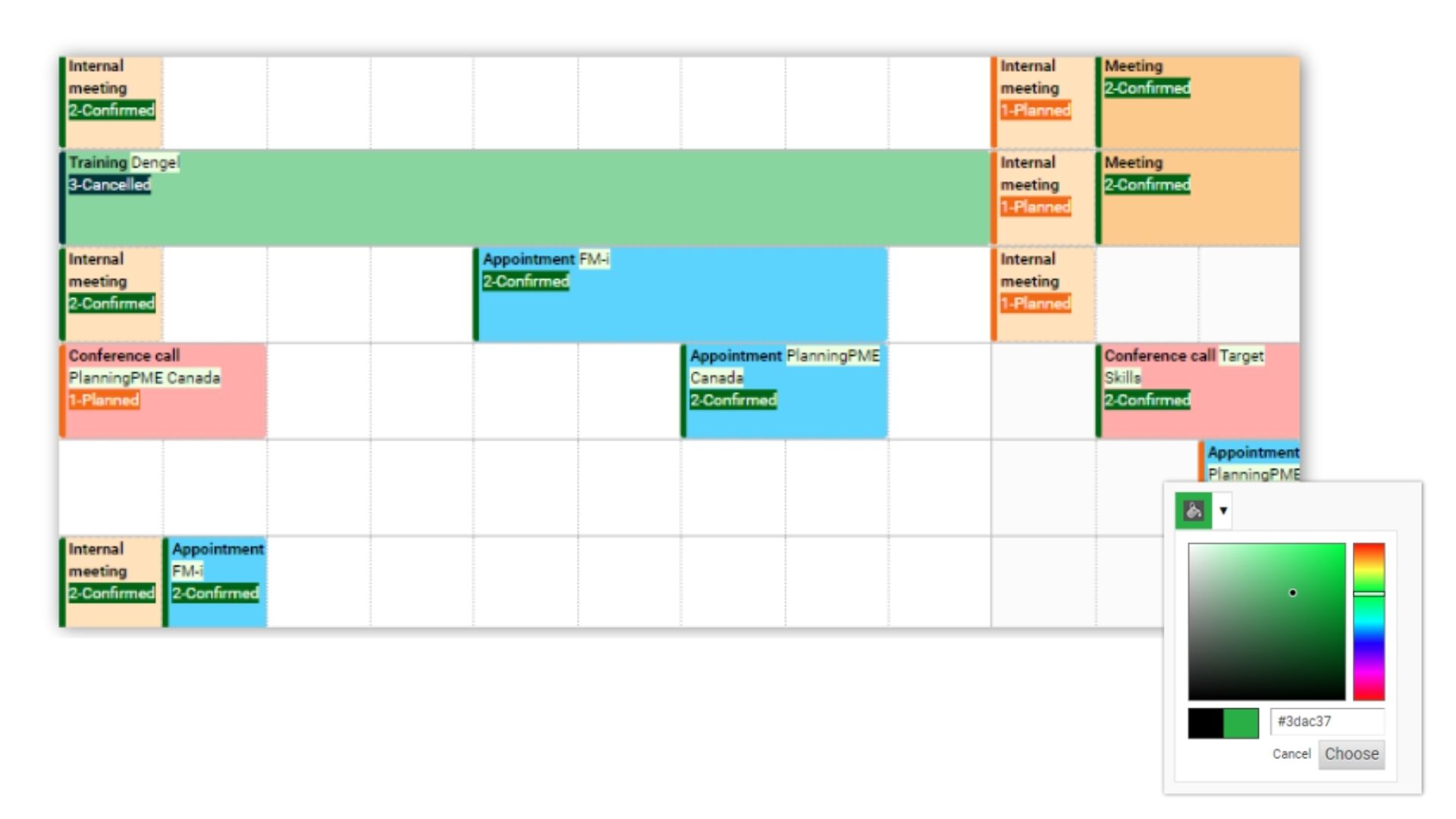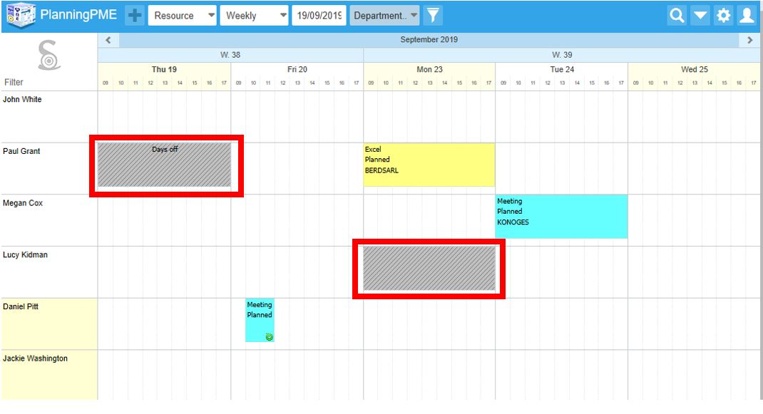 Ereignisse, die auf der Plantafel nicht geändert werden können, erscheinen im Transparenz im Vergleich zu Ereignissen, die durch einen Benutzer geändert werden können.