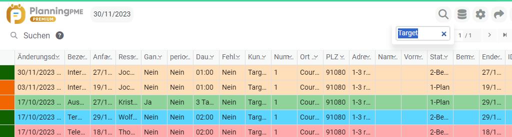 Die Suchfunktion, die von der Lupe oben rechts in der Planung erreichbar ist, wird jetzt auf neue Felder durchgeführt: benutzerdefinierte Felder vom Typ: Auswahl, Kommentar, Hyperlink, Link und Text, Adressfeld, Ort und Postleitzahl des Kunden oder Ort der Veranstaltung.