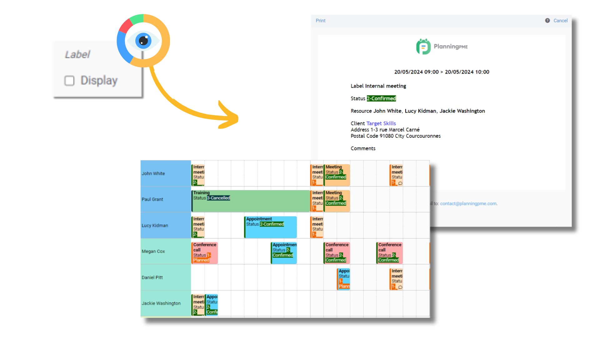 Über das Menü Extras - Beschreibung können Sie jedes Element, das auf der Planung angezeigt wird, individuell anpassen, sei es im Ereignisbalken, im Tooltip oder sogar in der E-Mail und den Ausdrucken. Je nach Art der Beschreibung stehen verschiedene Optionen zur Verfügung, um das Erscheinungsbild anzupassen: Zeilenumbruch, Kursivschrift, Fettdruck, Elementfarbe, spezifische Farbe usw.