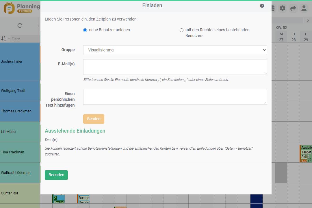 Bei der anfänglichen Einstellung der Planung hilft Ihnen der Konfigurationsassistent dabei, neue Benutzer zu erstellen und einzuladen. Sie können auf diesen Bildschirm auch zugreifen, indem Sie auf das Symbol „Teilen“ in der oberen rechten Ecke Ihrer Planung klicken.