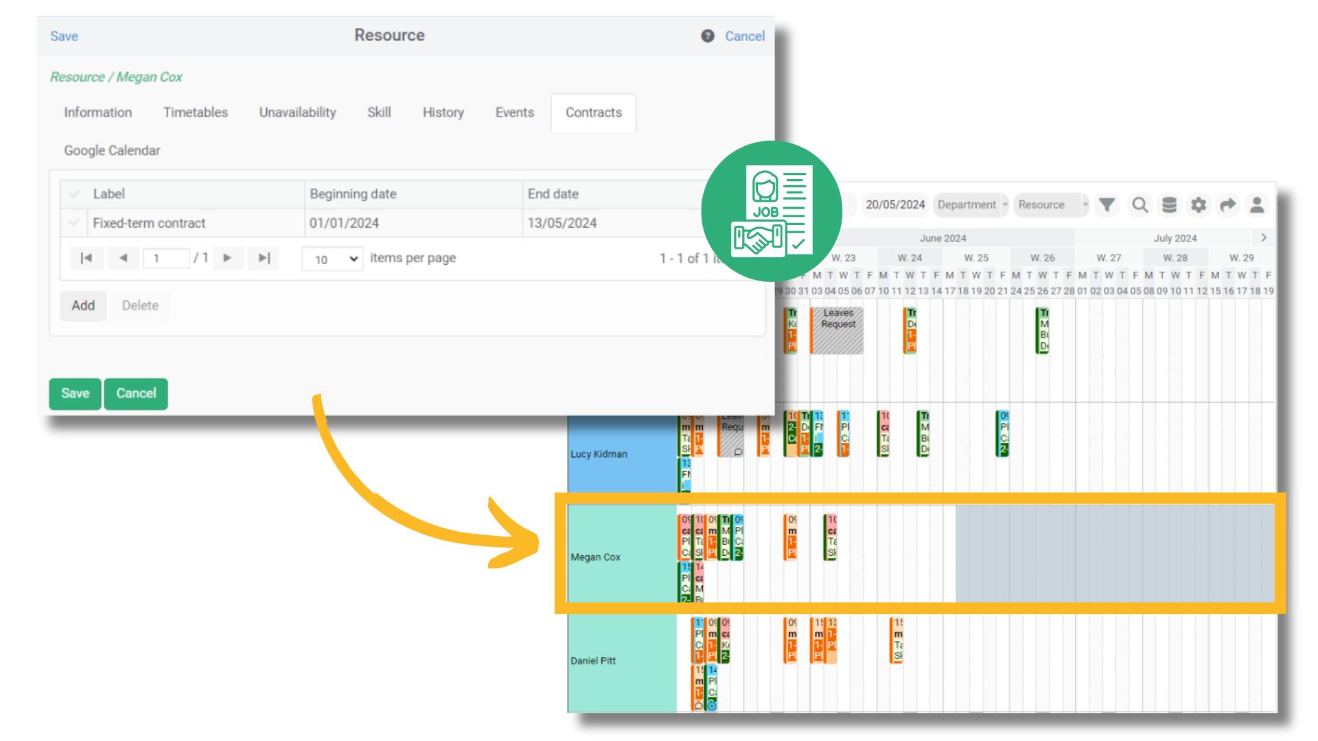 Sie können die Verträge für Ihre Personal- und Materialressourcen verwalten: unbefristete Verträge, befristete Verträge, Saisonverträge, Maschinenmieten usw.