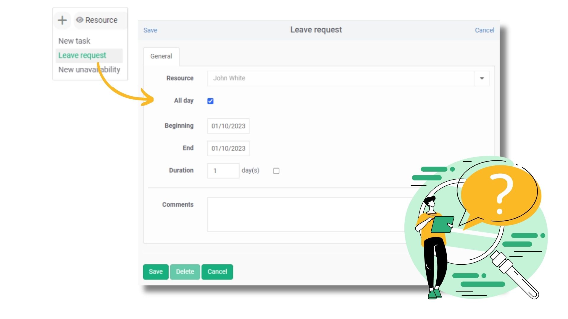 Es ist jetzt möglich, benutzerdefinierte Felder für Abwesenheiten zu erstellen. Sie können jeden Typ von Feld (Datum, Kommentare, Text usw.) erstellen. In der Praxis ist es beispielsweise möglich, durch die Erstellung eines Feldes "Angehängte Datei" Dokumente anzuhängen, um eine Abwesenheit zu rechtfertigen.