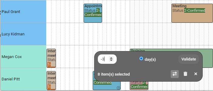- Auswahl von Ereignissen aus mehreren Elementen : Im Falle einer Auswahl von Ereignissen auf mehreren Elementen (Ressourcen, Projekte, Kunden, abhängig von der Zeitansicht) erfolgt die Duplizierung oder Verschiebung auf denselben Elementen.