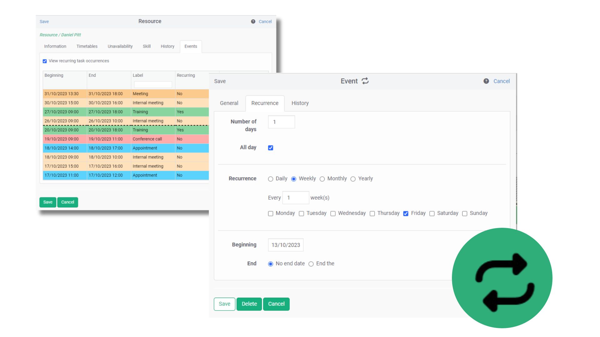 Sparen Sie wertvolle Zeit, indem Sie die Wiederholung bei mehreren Veranstaltungen in nur wenigen Klicks löschen. Wenn ein Mitarbeiter beispielsweise eine Woche im Urlaub ist und sein Zeitplan wiederkehrende Termine enthält, können Sie diese einfach löschen oder einem anderen Mitarbeiter zuweisen.