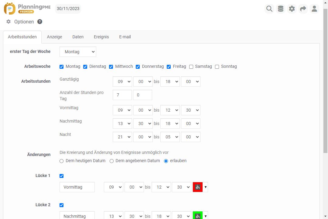 Arbeitswoche: Arbeitswoche: Wenn Sie Samstag und Sonntag deaktivieren, erscheinen diese Tage nicht mehr im Planungsbereich.