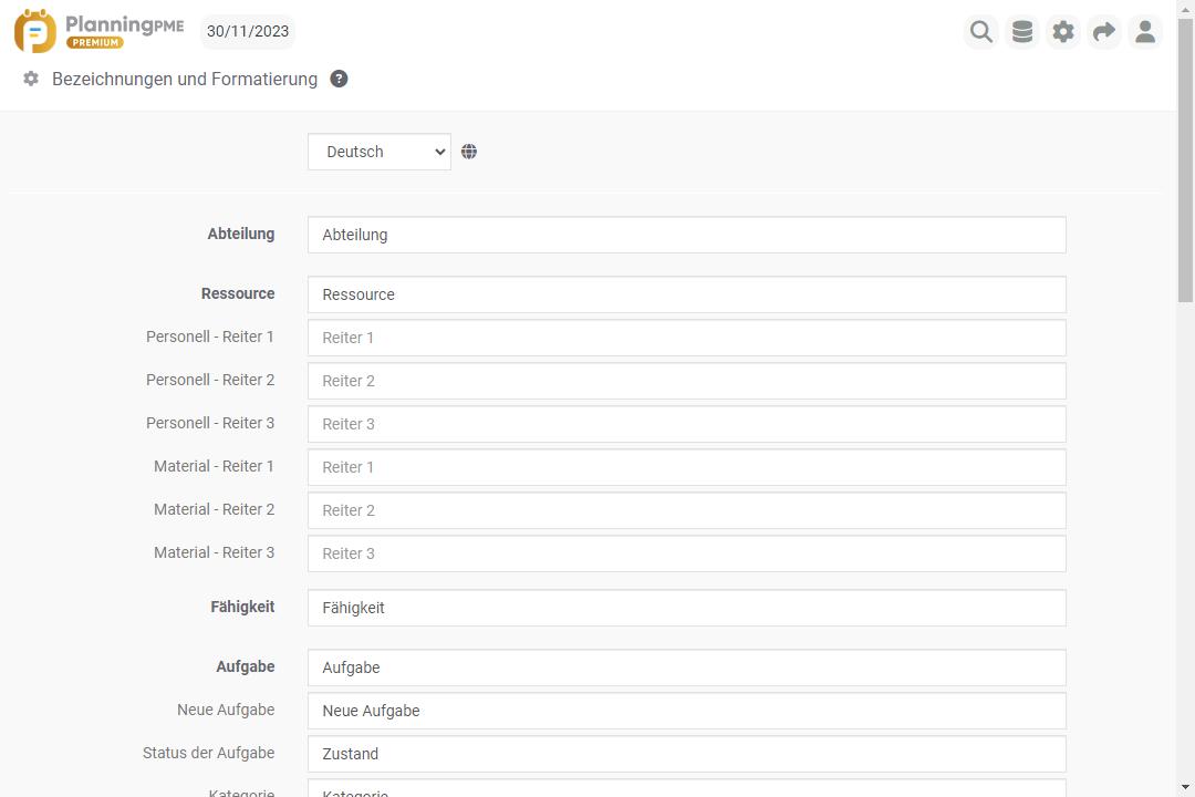 Im Menü Tools -> Formate können Sie die Begriffe umbenennen, die in der Software standardmäßig verwendet werden: Aufgabe, Kunde, Projekt, Kategorie usw.