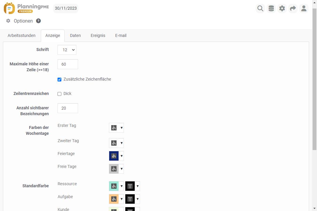 Im Menü "Anzeige" können Sie auch die Standardhöhe einer Zeile in der Planung auswählen. Wenn Sie die Höhe einer Zeile erhöhen, wird die Anzahl der im Ereignis angezeigten Informationen erhöht und gleichzeitig die Anzahl der auf dem Bildschirm sichtbaren Zeilen verringert.