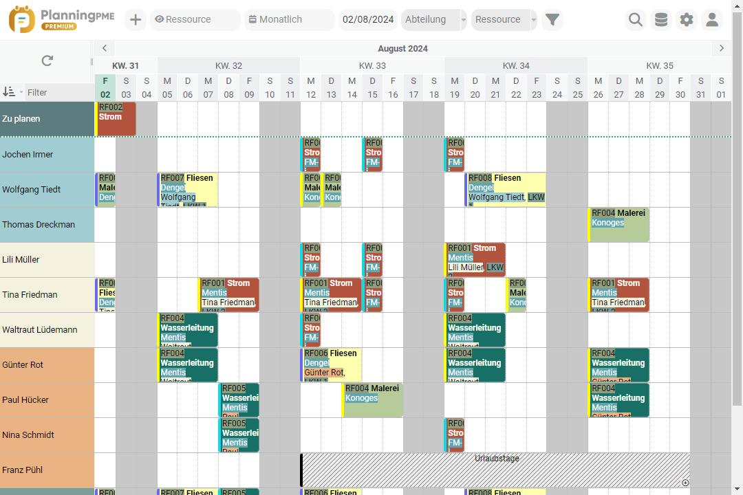 Mit PlanningPME können Abwesenheiten geplant und auf einen Blick angezeigt werden. Manager können ruhige Zeiten vorhersehen, Aufgaben verfügbaren Teams neu zuweisen und Fristen anpassen, um Auswirkungen zu minimieren. Diese Funktion hilft auch bei der Vorbereitung auf Spitzenmonate und bei der Identifizierung kritischer Zeiträume für Ressourcen.