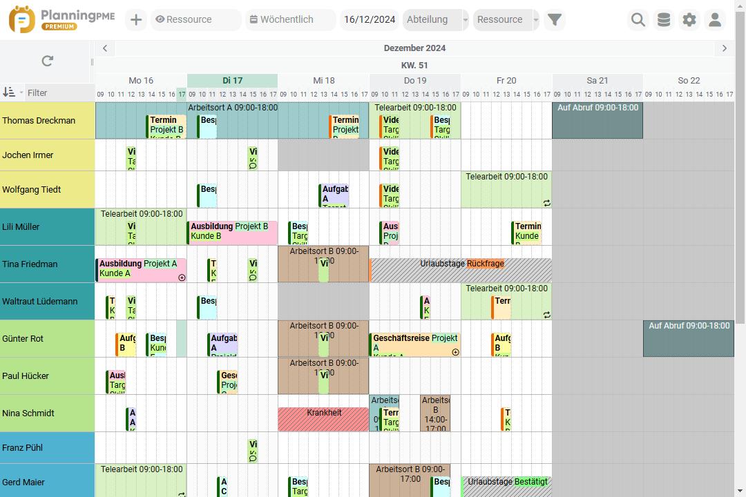 Eine der größten Herausforderungen in einer so anspruchsvollen Branche ist das Freizeitmanagement. PlanningPME bietet eine umfassende, zentralisierte Ansicht der Verfügbarkeit und Fehlzeit für jede Ressource. Abwesenheiten werden nach bestimmten Gründen kategorisiert: